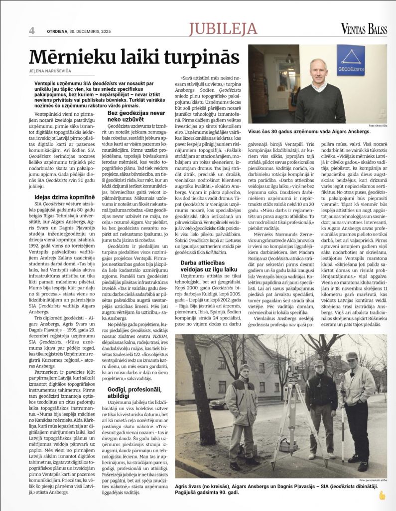 Ventspilnieki vieni no pirmajiem nozarē izveidoja patstāvīgu uzņēmumu, pirmie sāka izmantot digitālās topogrāfiskās iekārtas, izveidojot Latvijā pirmo pilsētas digitālo karti ar pazemes komunikācijām. Arī šodien SIA Ģeodēzists ierindojas nozares lielāko uzņēmumu trijniekā pēc nodarbināto skaita un pakalpojumu apjoma. Gada pēdējās dienās SIA Ģeodēzists svin 30 gadu jubileju.